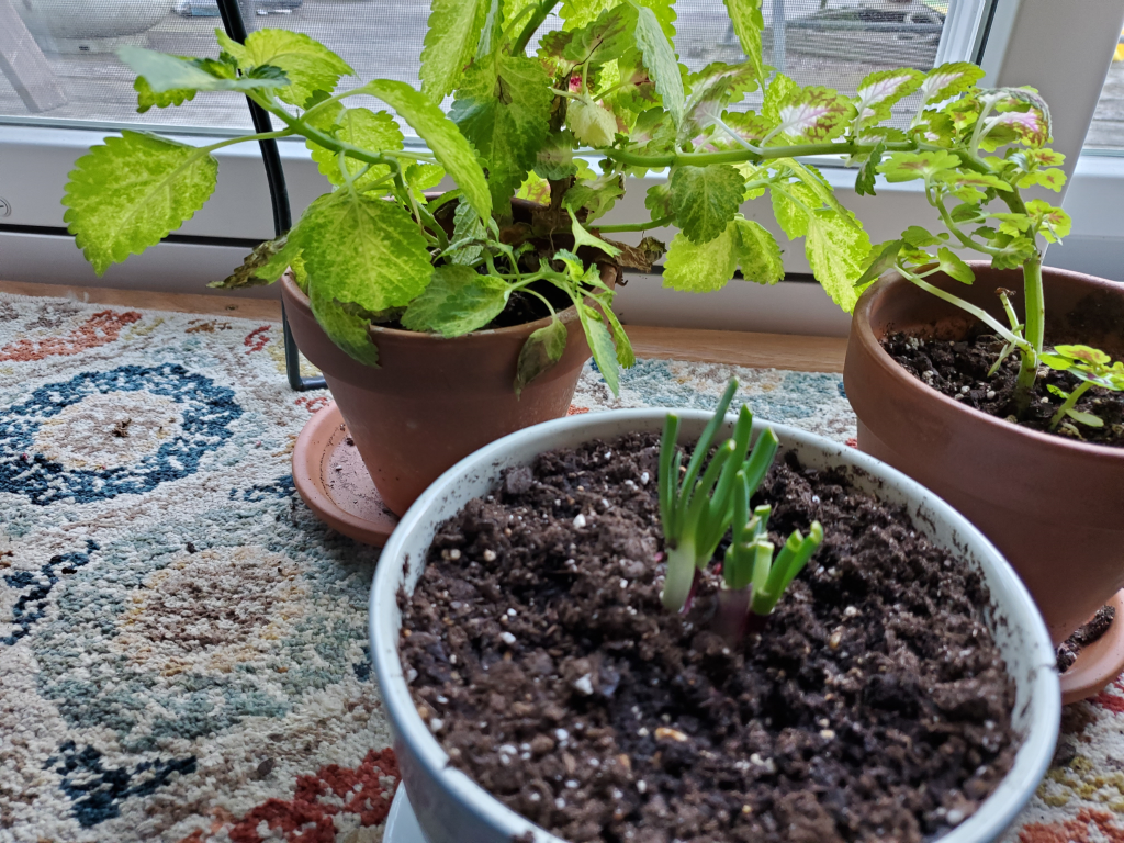 - Onions are very easy to grow indoors or out. You just have to cut the root of the onion off and make sure that you leave about a half an inch of onion when you do. Cover lightly with potting soil and keep in a sunny area. For green onions, simply put the white base with the roots intact in a container of water and place in direct sunlight. Change the water out every few days and the green will continue to grow. Just snip what you need and allow it to grow as long as you like.