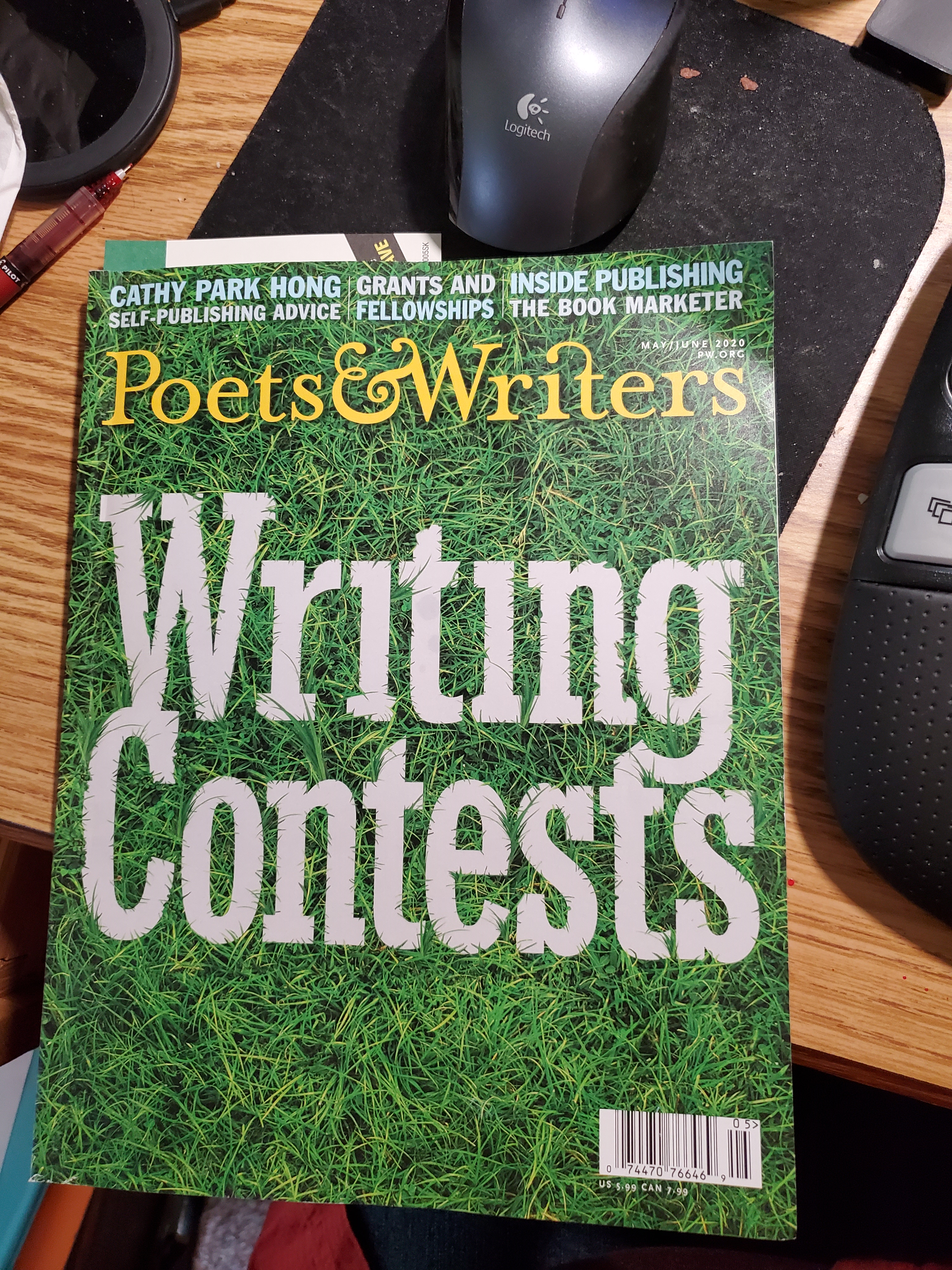 I was thinking about what to bring to you this week, and wouldn’t you know, Poets and Writers magazine showed up in my mailbox. The cover shouted Writing Contests, and just this week I had suggested that a couple of my students should submit some of their work somewhere. I didn’t tell them where because that had to be the choice of the writer. And honestly, it takes time to find the right fit.