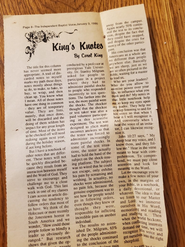 I about cried when they responded. I could tell by the return address. My hands shook as I tore it open and read the words, “Yes, we are interested.” I called my column Carol’s Corner and later, as the paper changed owners, King’s Knotes. That’s how it started, seriously, my writing career. Over forty years ago.